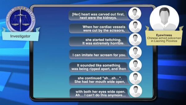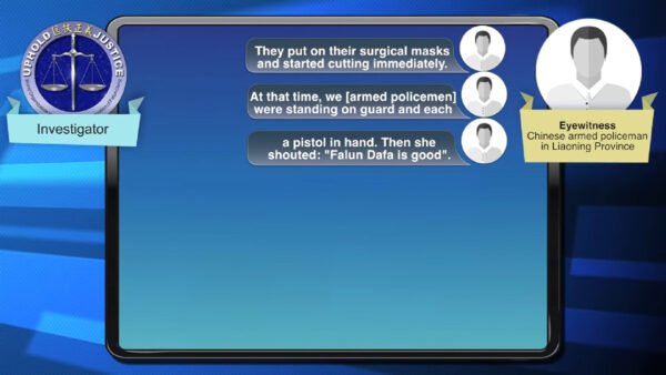 Transcript of the recording of an armed police’s testimony, who is on duty at the scene of an organ harvesting operation in Liaoning Province. (Screenshot from YouTube)